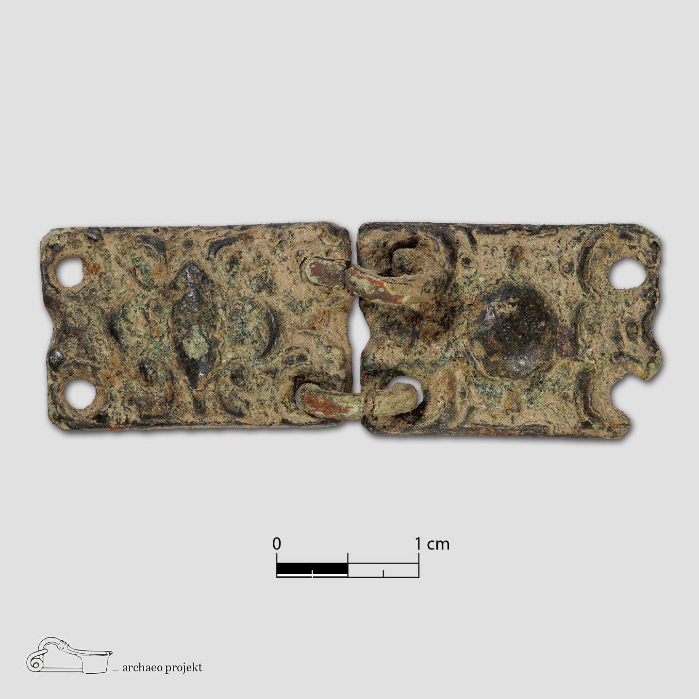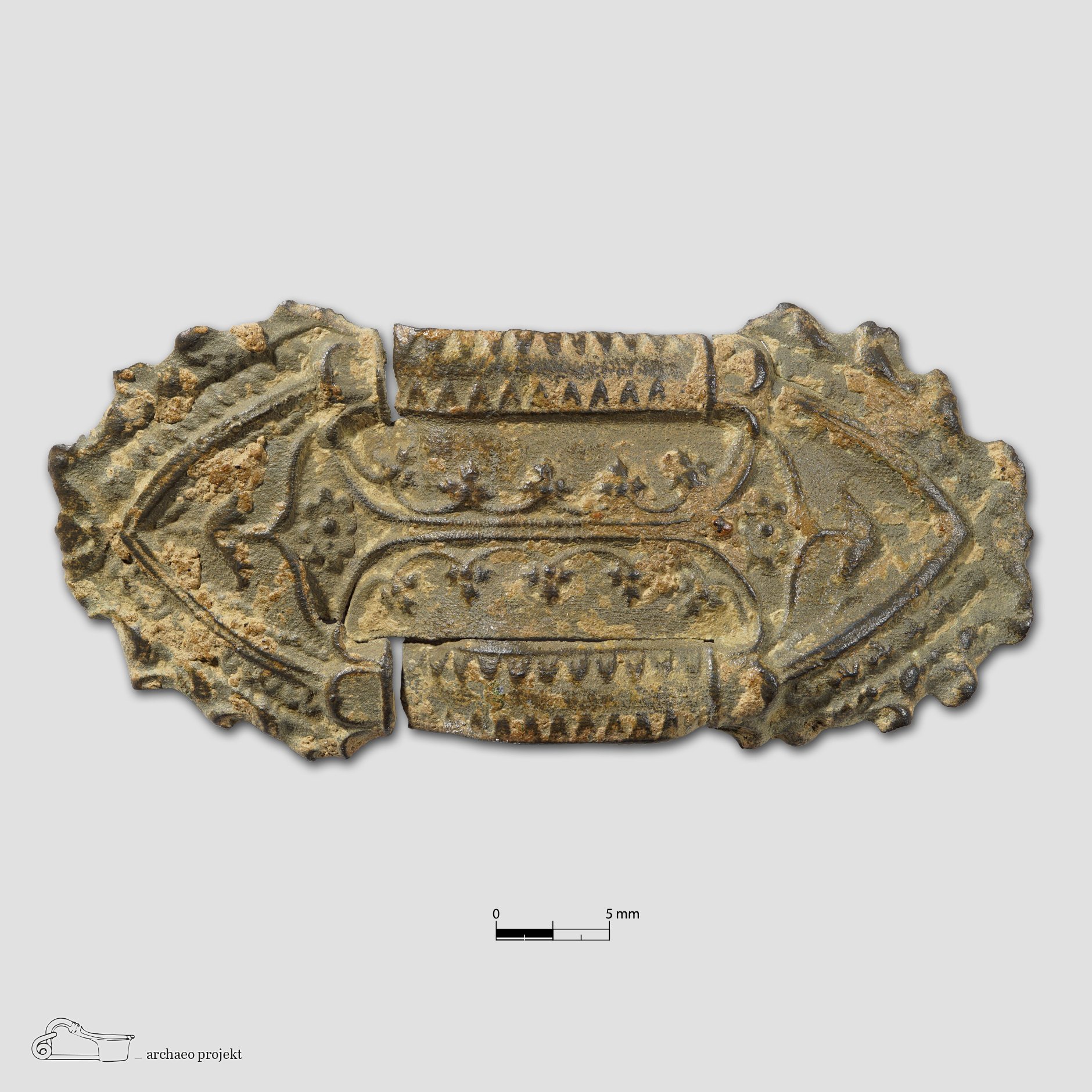 | Beschreibung | Kleiner Gürtelhaken mit Verzierung im Stil der früheren Blankwaffenhaken. Vermutlich eher Schmuck als Funktion. |
