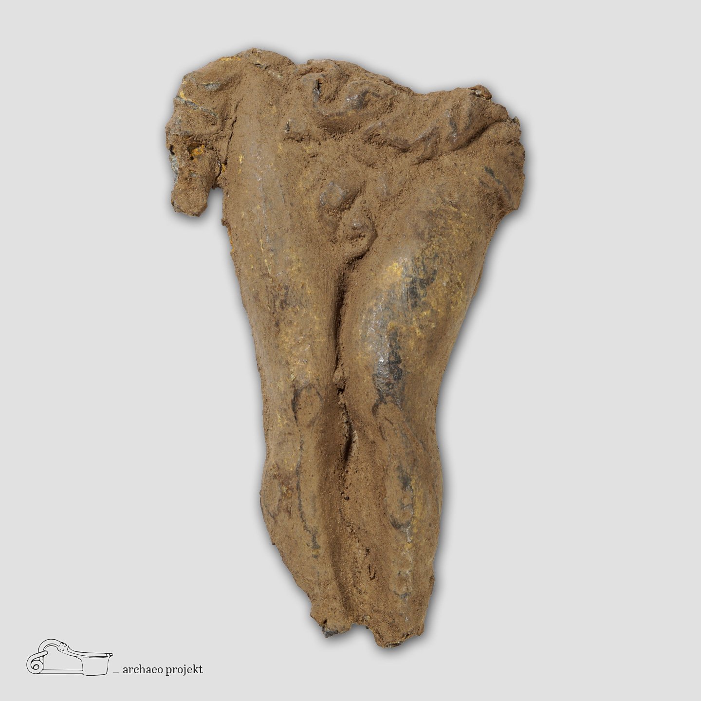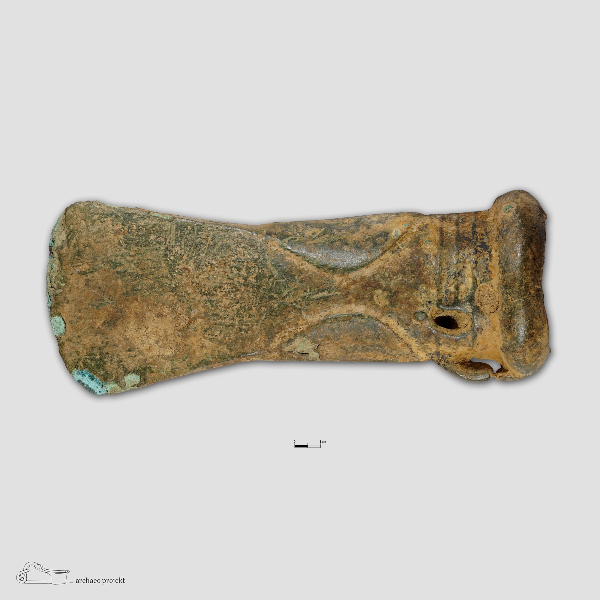 | Beschreibung | Tüllenbeil mit Lappenornament und Rippung. Unterhalb der Mündungswulst befindet sich eine Rippung und eine vertikale Öse. Darunter sind ovale Lappen angesetzt. (Länge 9,6 cm) |