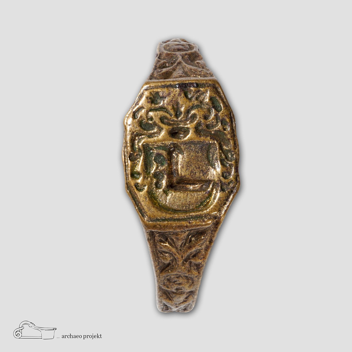| Beschreibung | Siegelring mit Besitzermonogramm, in die Schultern ist ein florales Motiv geprägt. (⌀ 21 mm; Gewicht: 5,43 g) |